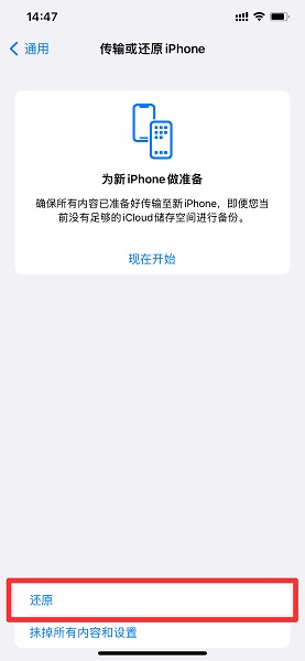 在通用设置中,点击传输或还原iPhone。