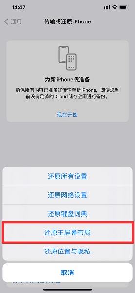 在展开的选项中,点击还原主屏幕布局。