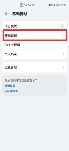 在移动网络界面中,点击移动数据。