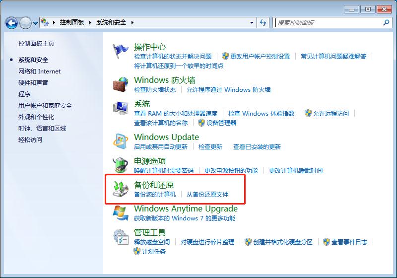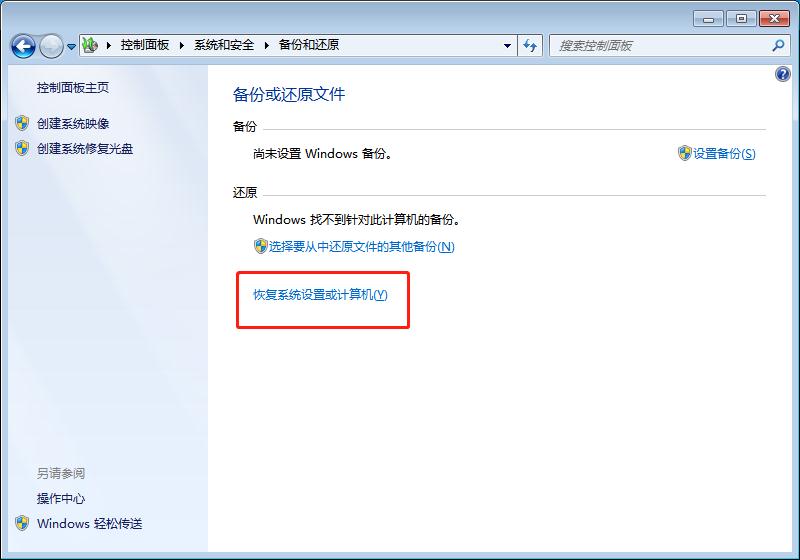 在备份和还原界面中,点击恢复系统设置和计算机。