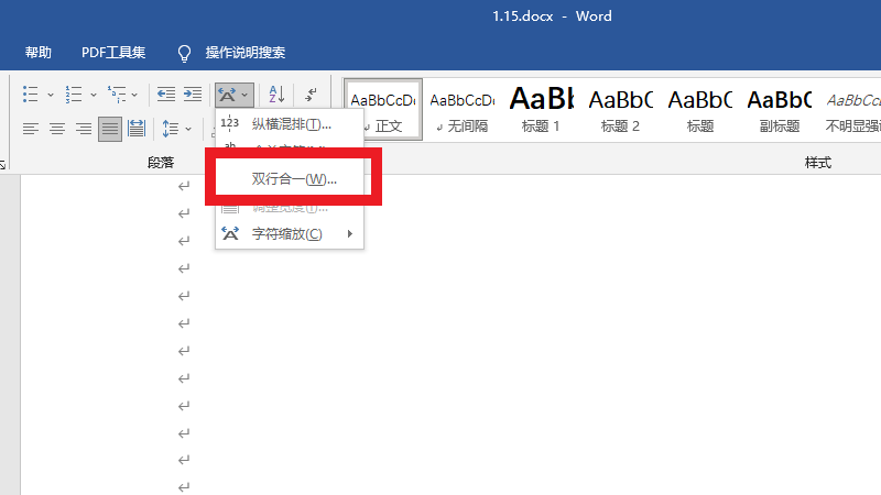 在中文版式界面中,点击双行合一。