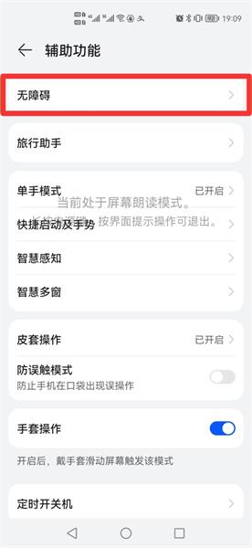 在辅助功能界面中,点击无障碍。