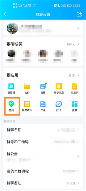 在群聊设置中,点击签到即可。