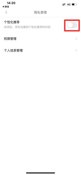 在隐私管理界面中,点击关闭个性化推荐。