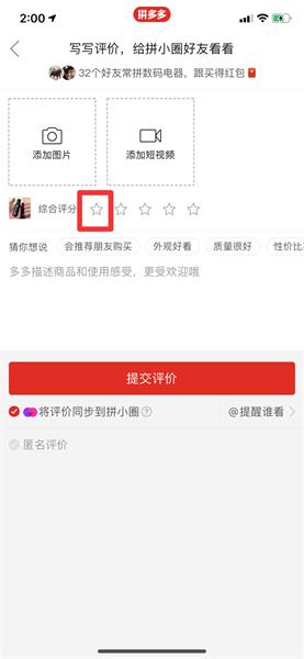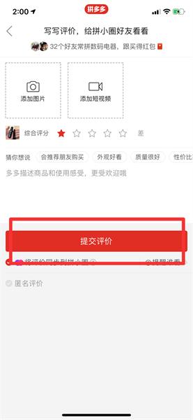 简介:1、在个人主页界面中,点击写评价。2、在展开的界面中,点击暂不拍摄,去评分。3、在展开的界面中,点击一星。4、选择后,点击提交评价。本视频由iPhone 12、IOS15.4、拼多多5.91.0录制