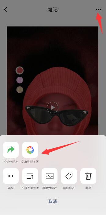 插入视频后,点击右上角的三点图标,点击分享到朋友圈。
