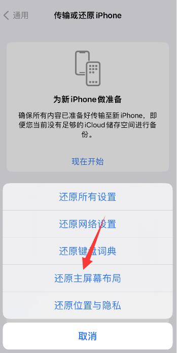 弹出窗口,选择还原主屏幕布局即可。