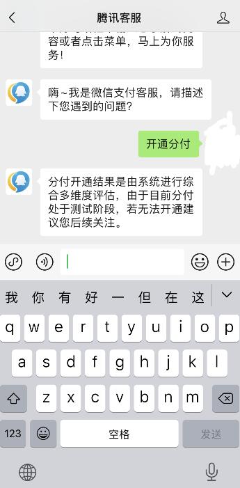 进入腾讯客服界面,输入开通分付,会提示目前分付处于测试阶段。