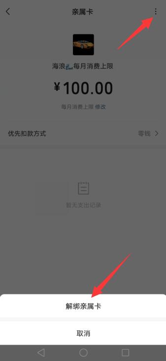 进入页面后,点击右上角的三点图标,点击解绑亲属卡即可。