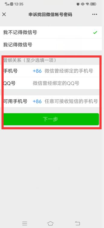 输入微信曾经绑定关系手机号和QQ号,输入可用手机号,点击下一步,根据流程操作完成即可。