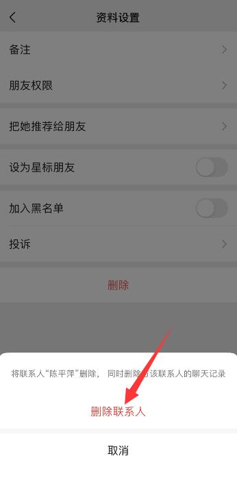 点击右上角的三点图标,点击删除,再点击删除联系人即可。