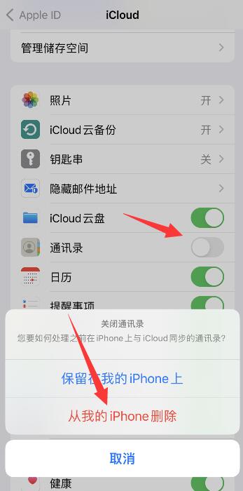 点击iCloud,关闭通讯录右侧按钮,点击从我的iPhone删除,即可批量删除通讯录。