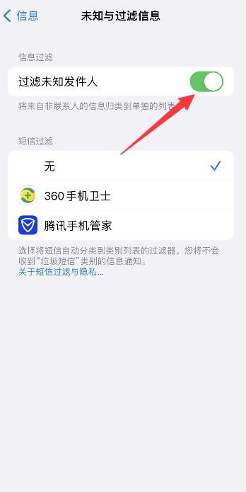 点击未知与过滤信息,进入页面,将过滤未知发件人右侧按钮开启即可。