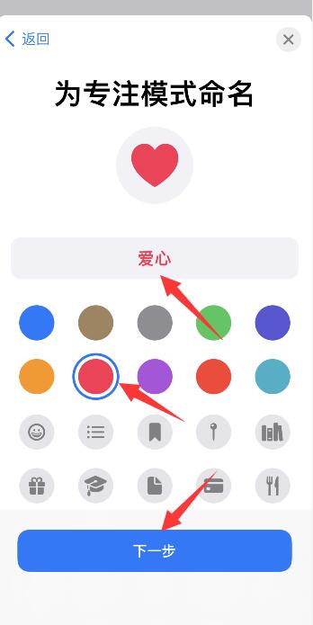 进入页面,输入名称,选择爱心图案,选择颜色,点击下一步。