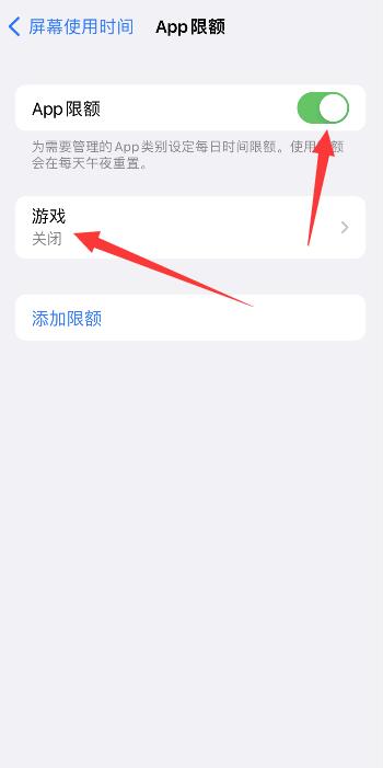 点击APP限额,进入页面后,开启APP限额,点击游戏选项。