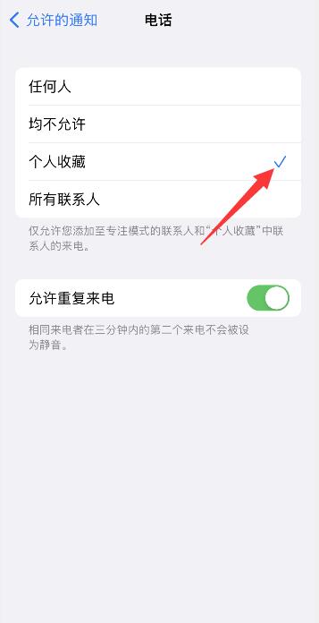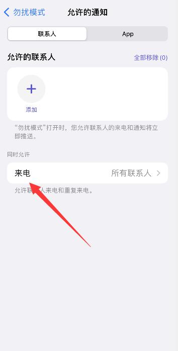 点击允许的通知下方联系人,点击来电选项。