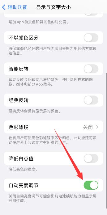 点击显示与文字大小,进入页面后,将自动调节亮度右侧按钮开启即可。