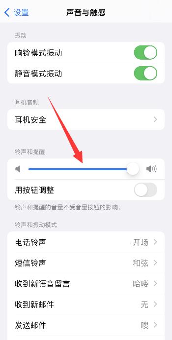 进入页面,将铃声和提醒下方声音滑动滑块进行调整声音大小,也可以按侧部音量加键调整。